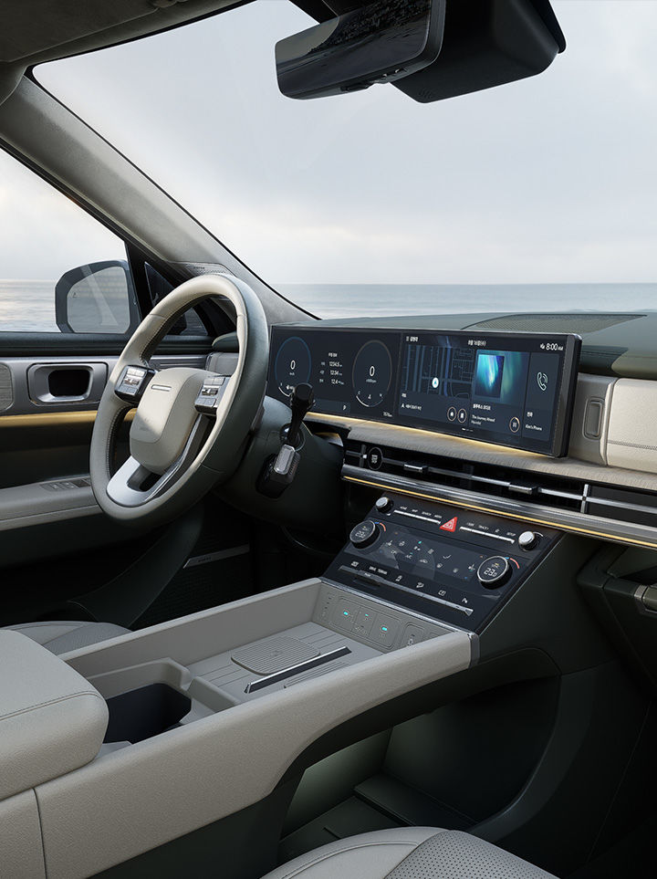 디 올 뉴 산타페의 내부 디자인은 고급스러운 느낌을 주는 블랙과 브라운 컬러를 기본으로 사용하며, 대시보드와 센터 패널 등에는 12.3인치 디지털 클러스터와 14.5인치 터치스크린 디스플레이가 장착됩니다.