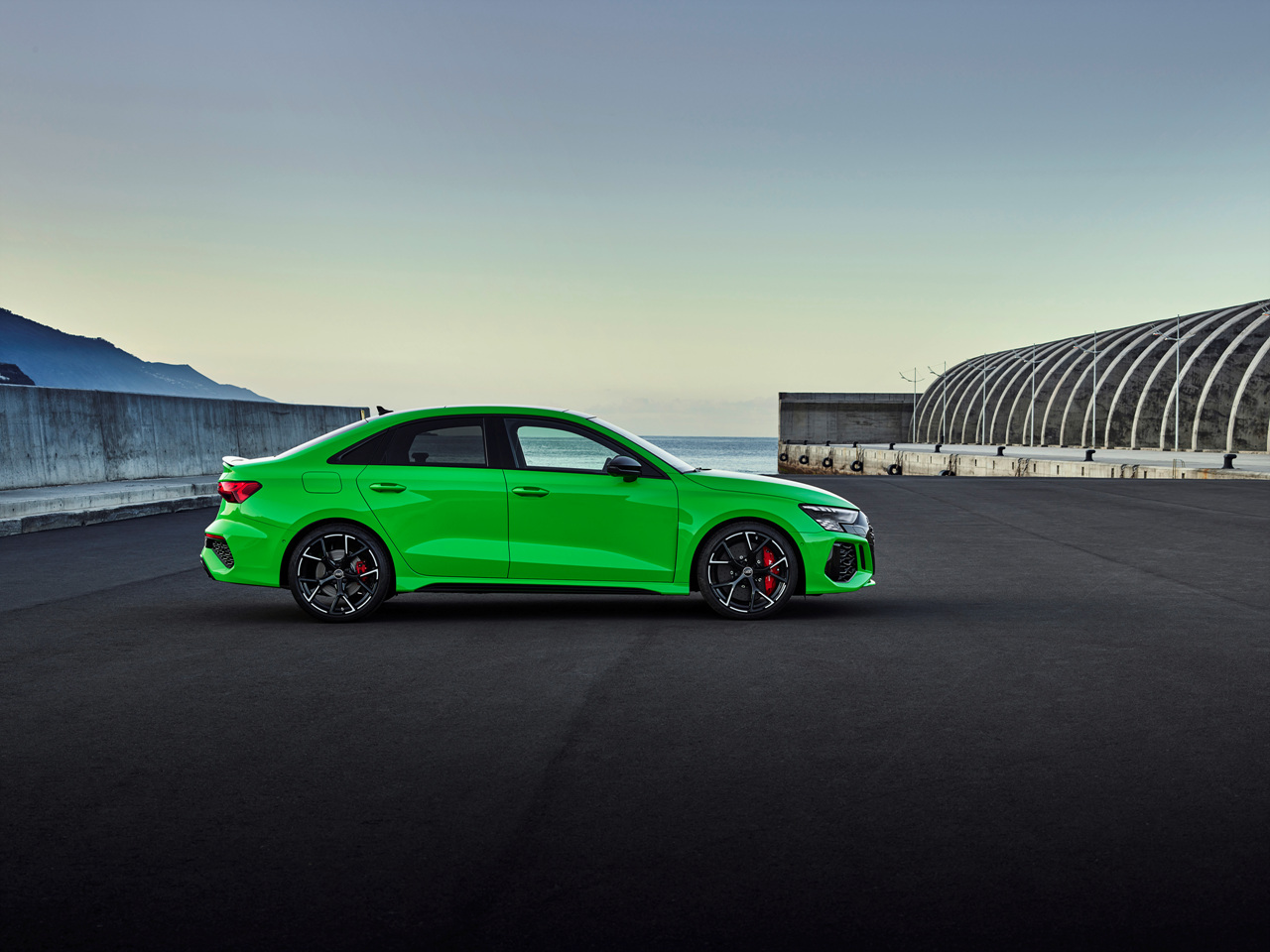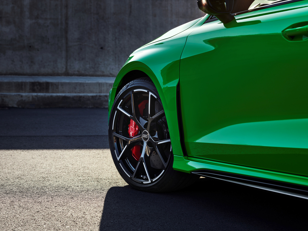 ㅁ 전면 범퍼에는 RS3 전용의 스포일러와 에어 인테이크가 적용되어 더욱 스포티한 분위기를 연출합니다. RS3의 측면 디자인은 날렵한 라인과 RS3 전용의 19인치 휠로 이루어져 있습니다.
