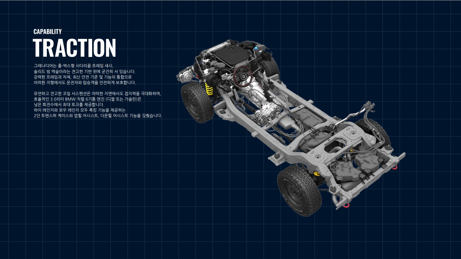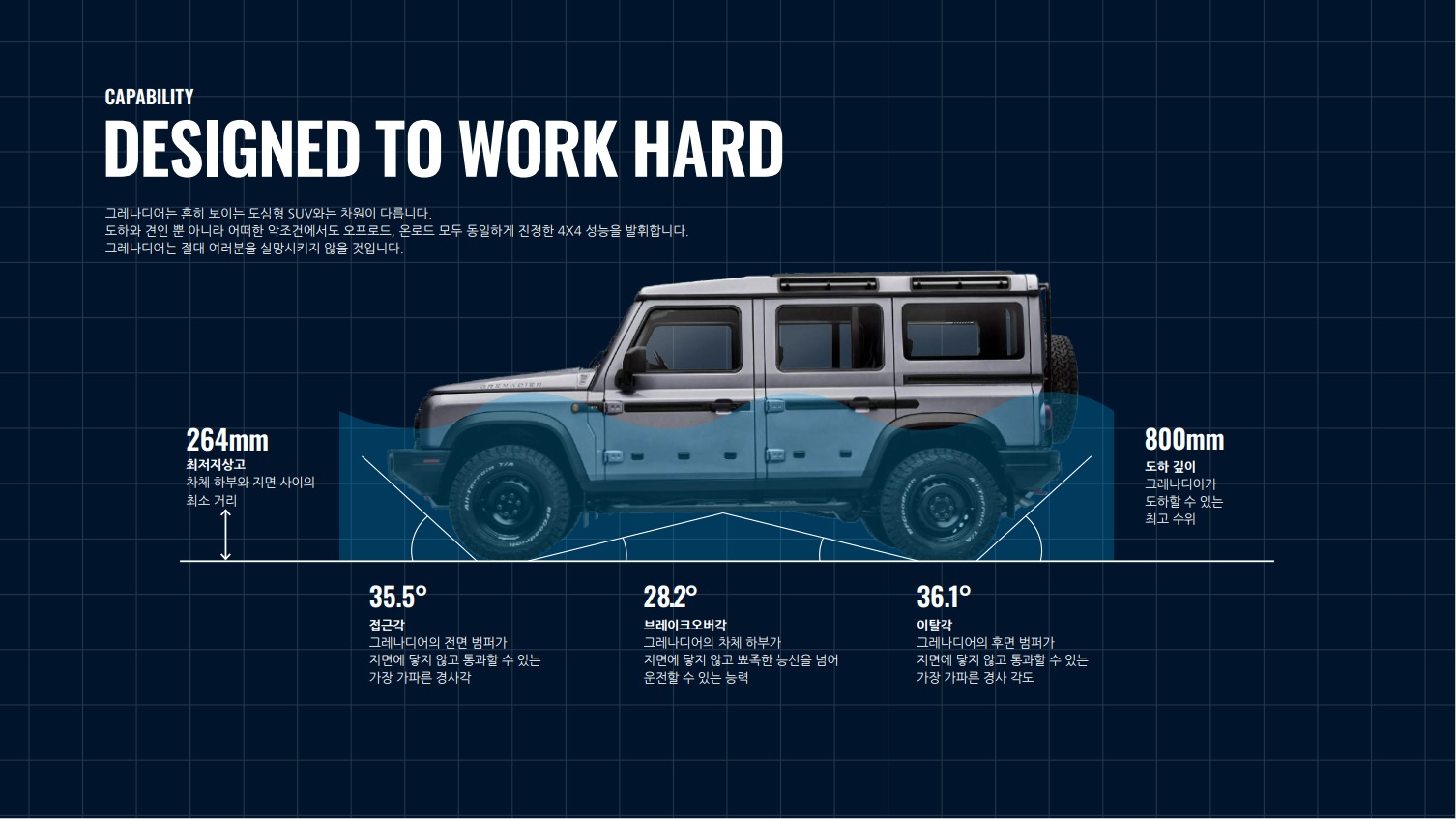 이네오스 그레나디어는 다양한 수상 경력으로 검증된 엔진과 사다리꼴 프레임 섀시, 상시 사륜구동 시스템, 최대 3개의 록킹 디퍼렌셜, 솔리드 빔 액슬을 갖추고 있습니다