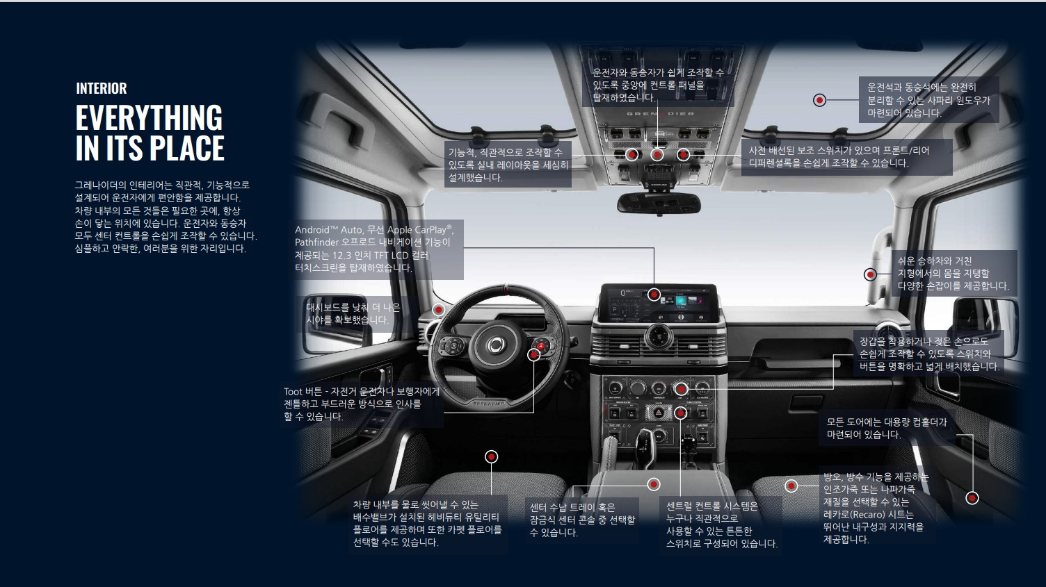 이네오스 그레나디어의 내부 디자인은 수류탄 투척병의 내부를 연상시키는 단단하고 견고한 디자인으로, 최신 항공기, 보트, 심지어 트랙터를 주의 깊게 살펴보았다고 합니다. 스위치는 최적 기능을 위해 있고, 정기적인 제어 장치는 가까이에 있고, 보조 장치는 더 멀리 떨어져 있도록 설계되었다고 합니다