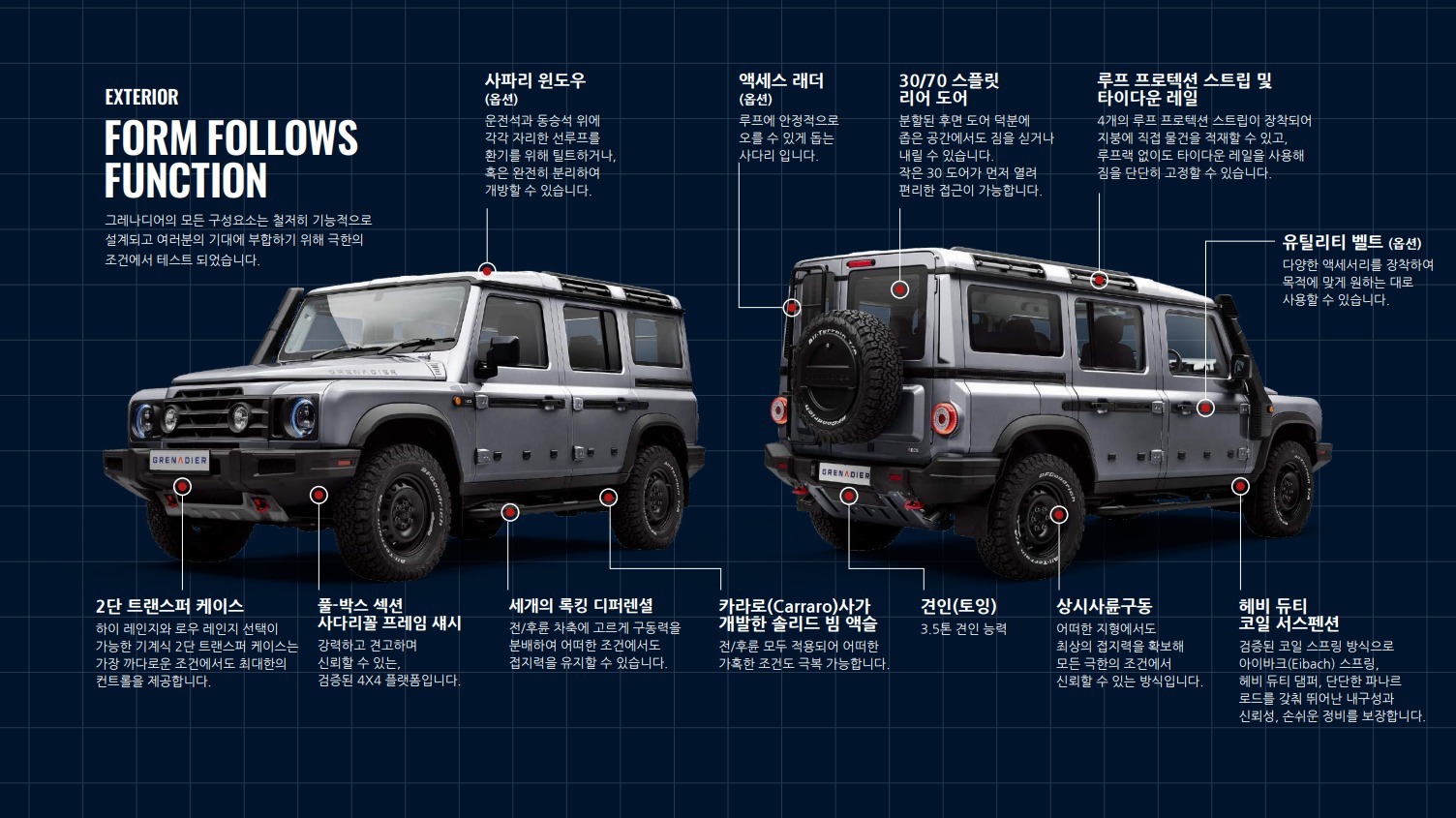 이네오스 그레나디어의 외관 디자인은 터프하고 투박하지만 최신 기술들을 곳곳에 접목한 단도직입적인 스타일로 유행을 타지 않으면서도 주변의 시선을 사로잡는 모습으로 자질구레한 스크래치, 이물질 등으로 인한 오염, 상처 등은 그저 자연 속에서 경험하는 추억, 훈장과 같이 늘 함께 하는 것이라 말할 수 있습니다.