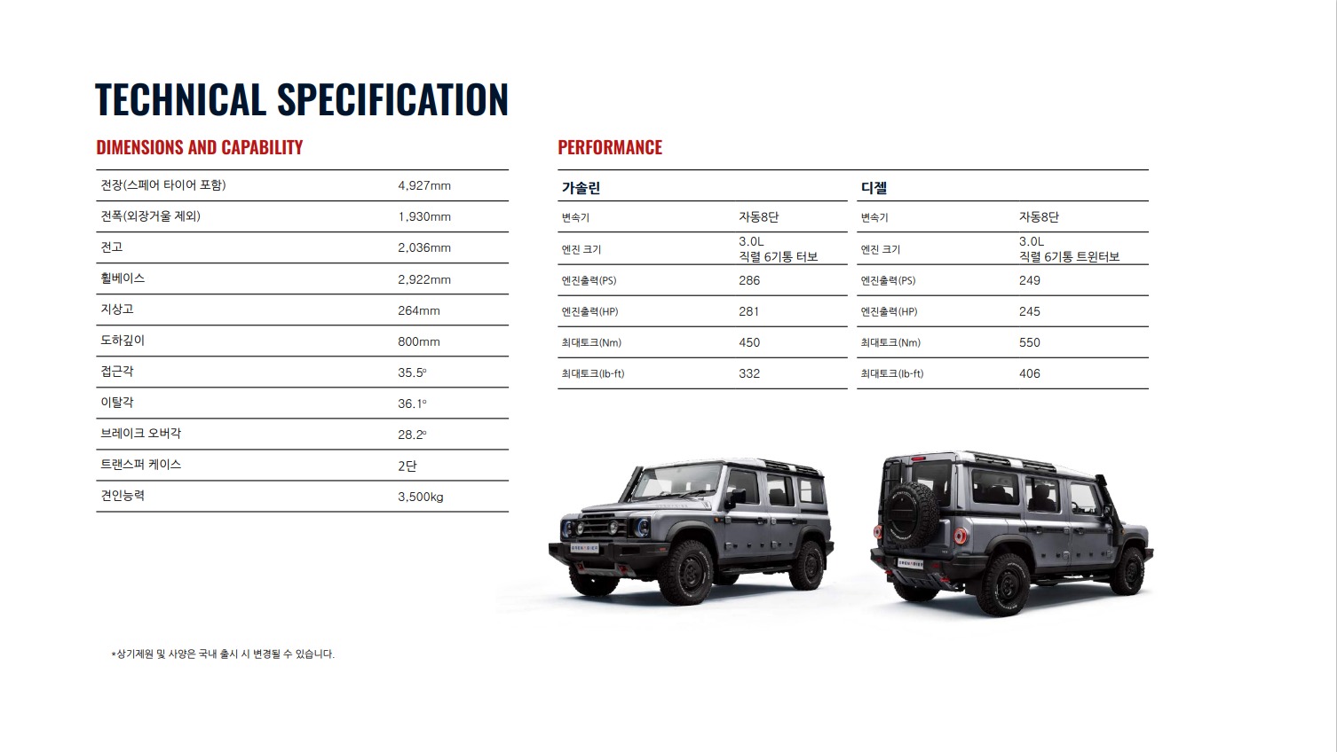 디젤의 최고출력은 249마력이며 최대토크는 56.1kgm입니다. 견인 등급은 3.5톤이며 상시 4륜구동 시스템을 탑재하였습니다. 이네오스 그레나디어는 정통 오프로더를 표방한 만큼 상시 사륜구동 시스템을 탑재하였으며 최대 견인력은 5.5톤을 보입니다