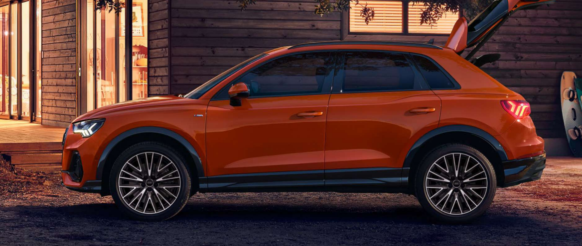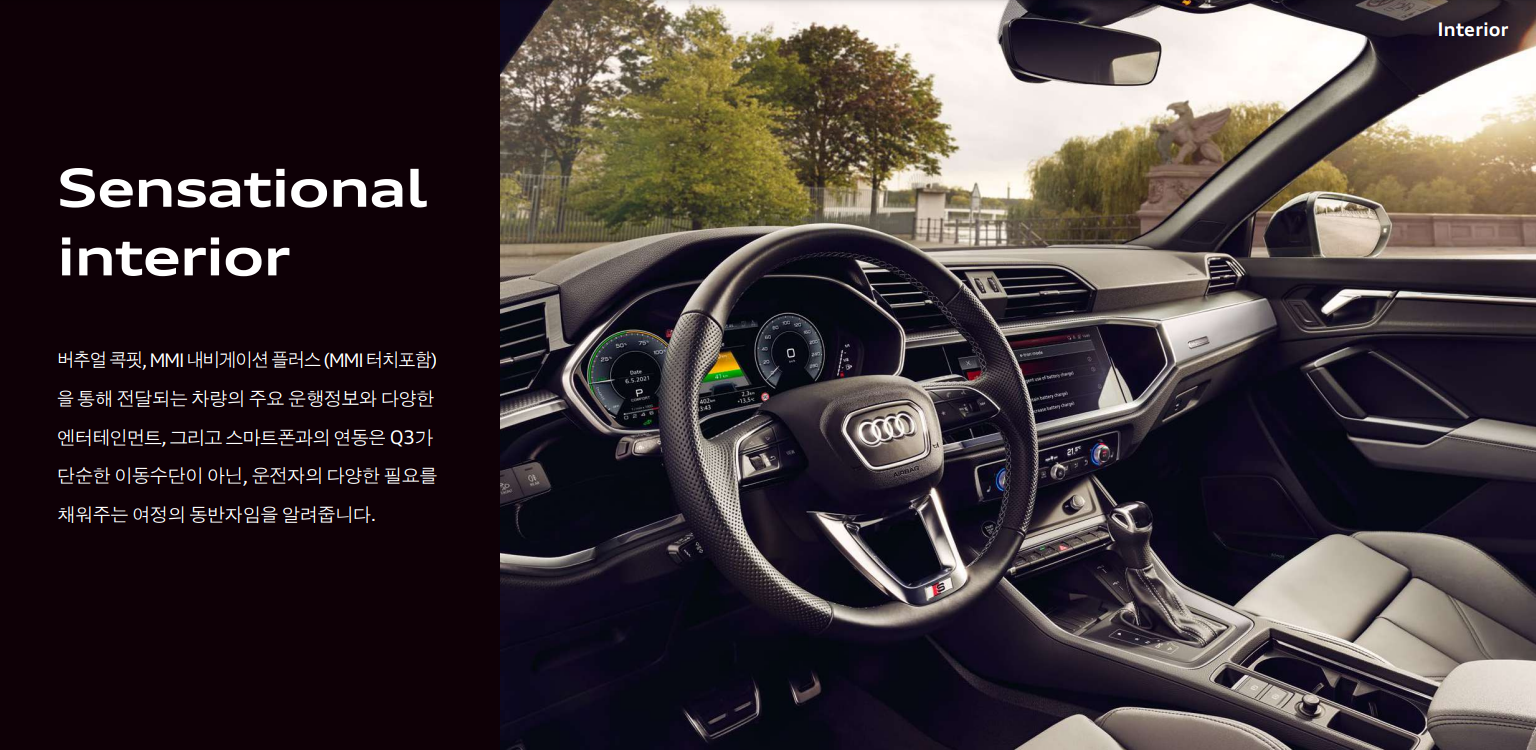 2) 측면 유려한 라인: 유려한 라인은 Q3 40 TFSI 콰트로의 역동적인 모습을 강조합니다. 19인치 알로이 휠: 19인치 알로이 휠은 Q3 40 TFSI 콰트로의 스포티한 분위기를 연출합니다.