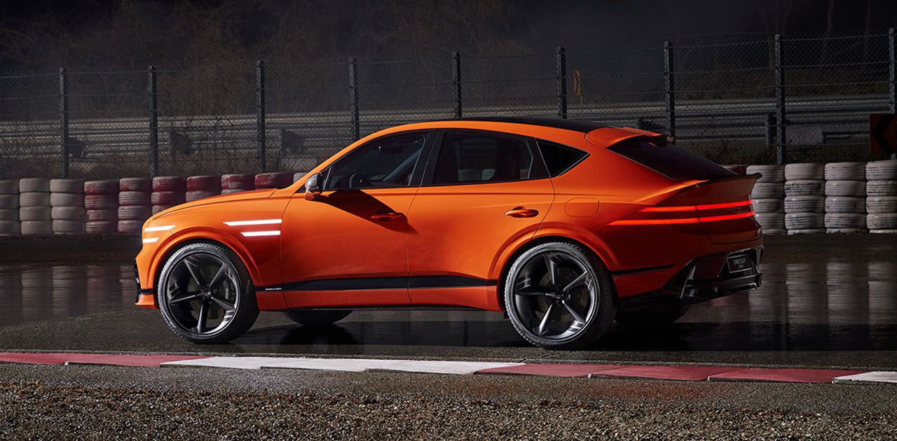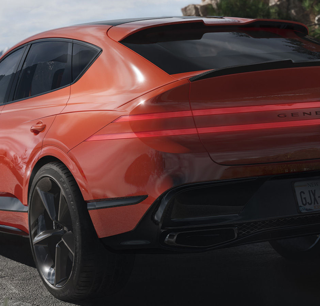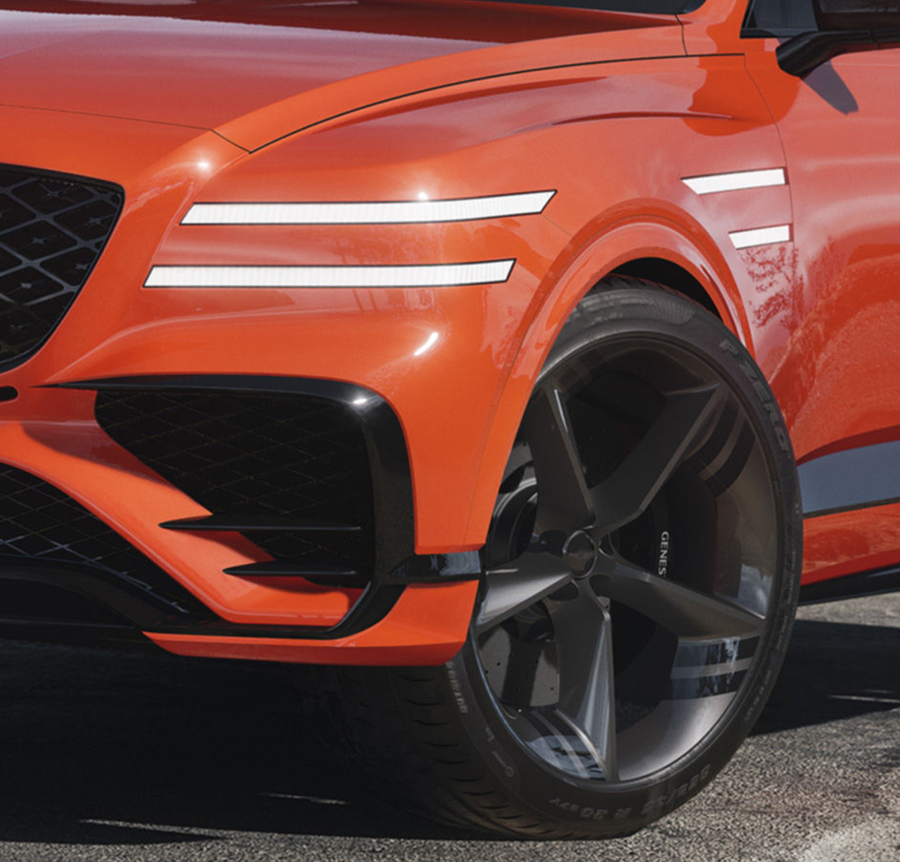 또한, 전면 그릴은 GV80보다 더 넓고 낮게 디자인되었으며, 헤드램프는 쿼드램프 디자인을 적용했습니다. 테일램프는 GV80의 테일램프를 기반으로, 리어 램프 그래픽을 변경했습니다. 범퍼는 GV80보다 더 넓고 낮게 디자인되었으며, 사이드 스커트에는 스포츠 바디킷이 적용되었습니다.